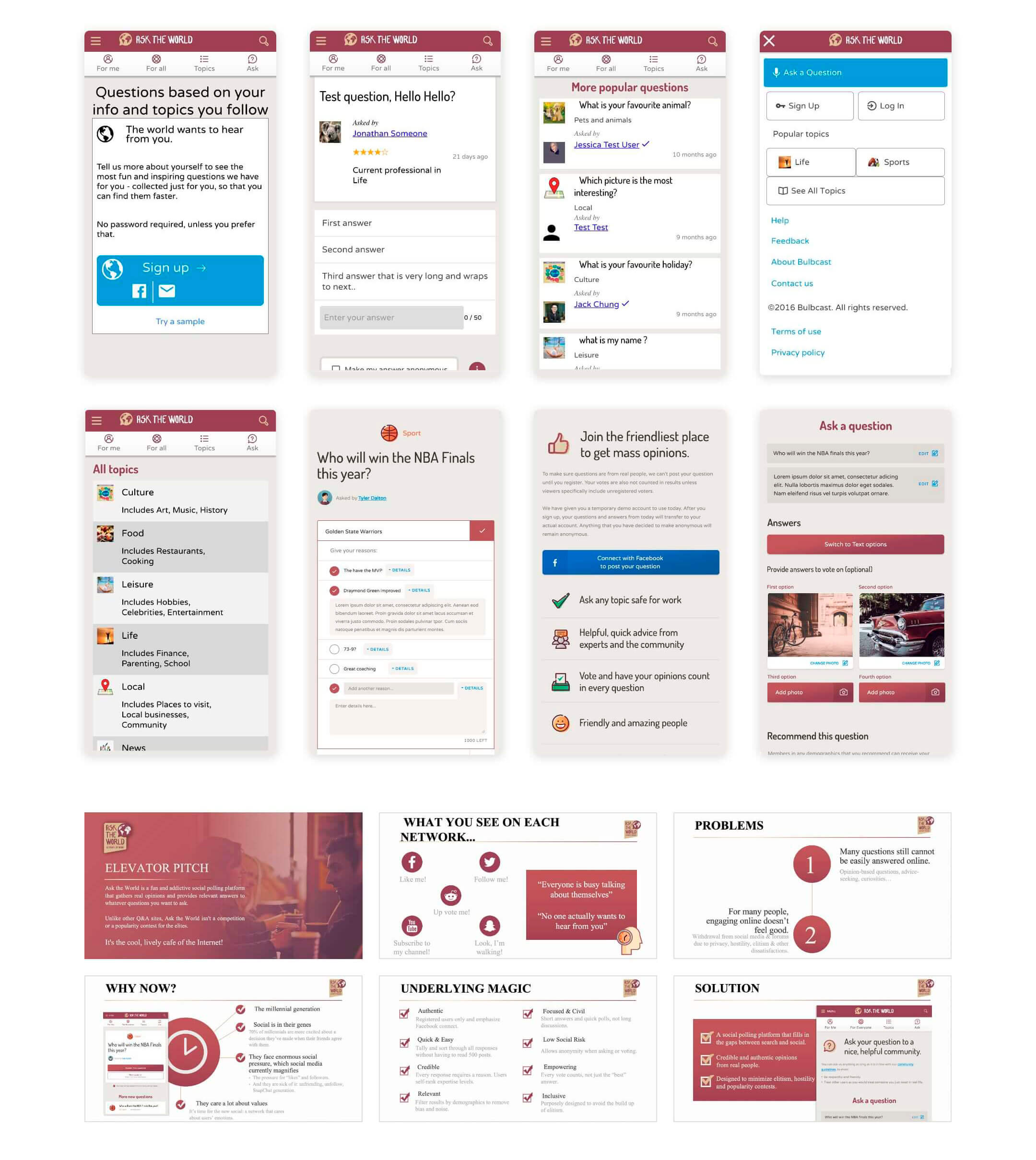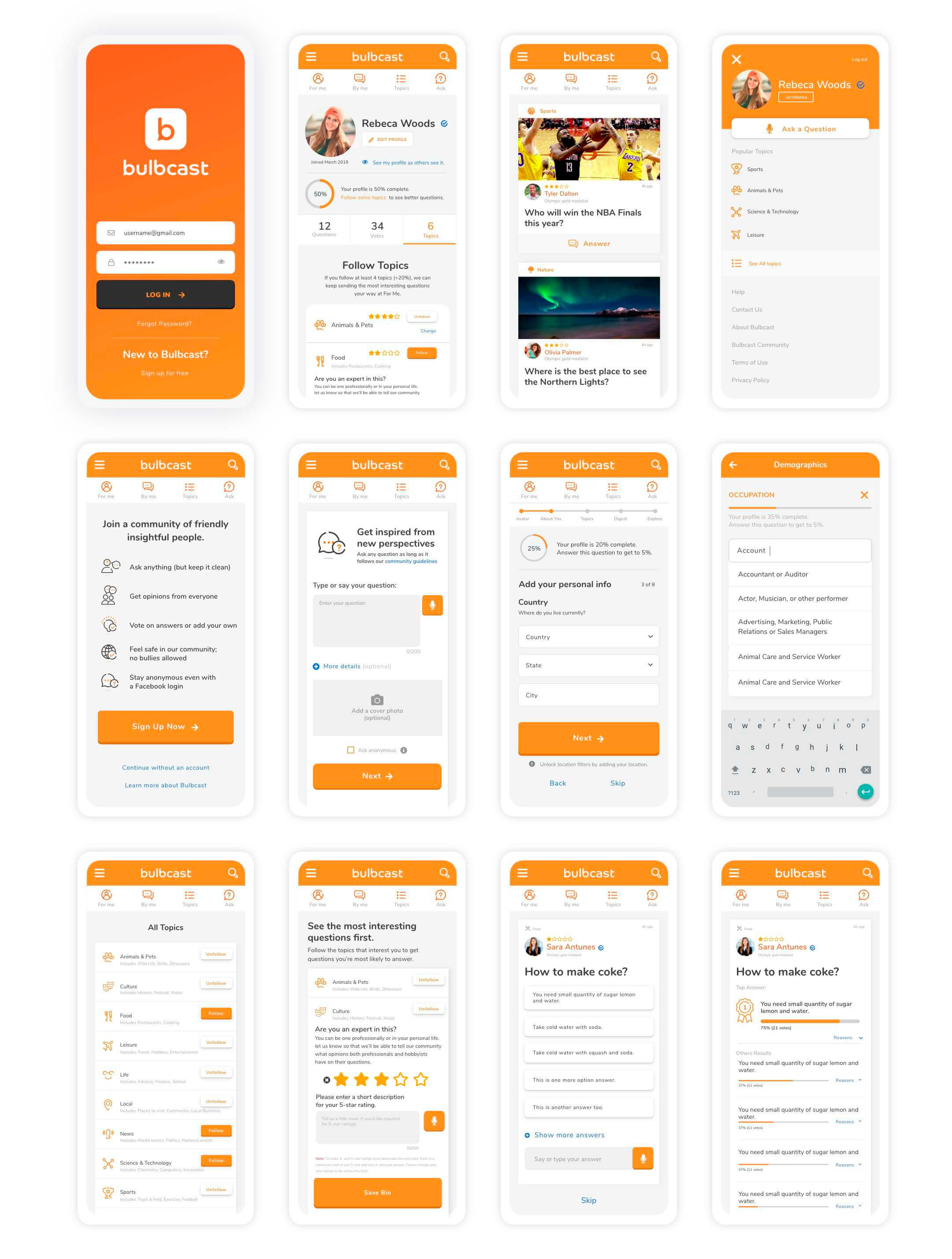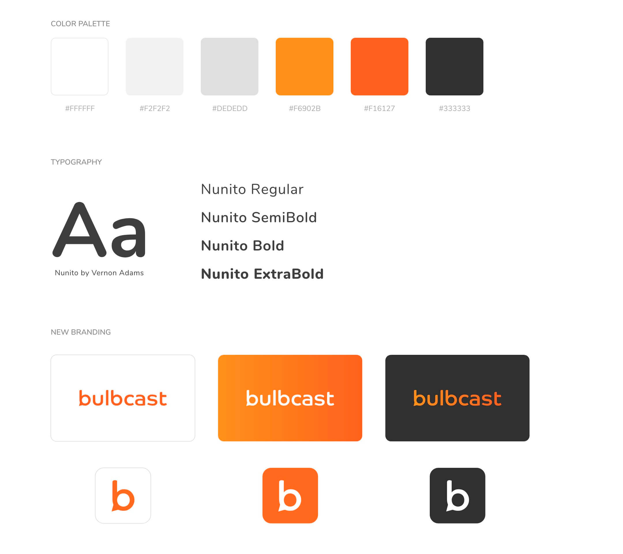 Um novo branding foi criado para deixar o visual mais moderno. O nome do app, Ask the World, passou a ser Bulbcast e uma nova tipografia foi definida, assim como uma nova paleta de cores mais jovem e vibrante.